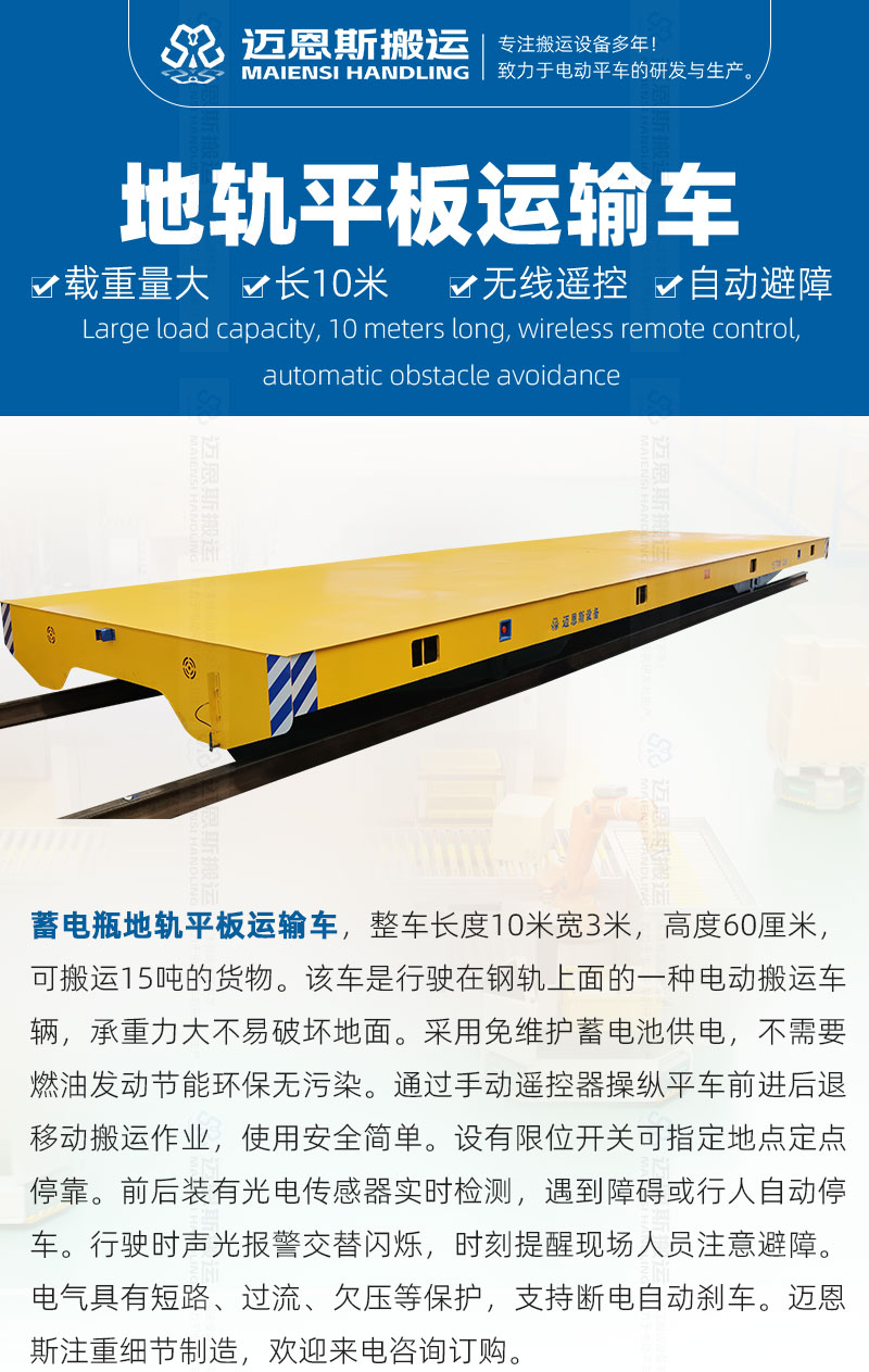 —— 查看更多舵輪全向移動電動平車,該車平臺長度7米,寬2.4米,高度92厘米,客戶主要用來搬...