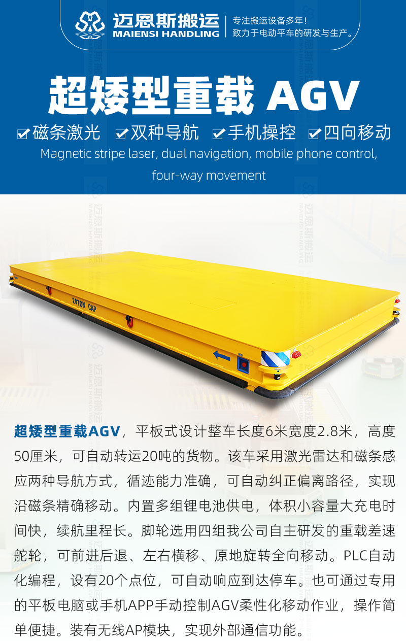—— 查看更多這是一臺磁導(dǎo)航重型AGV客戶使用現(xiàn)場,整車長度4.5米,寬2.8米,高90厘米,...